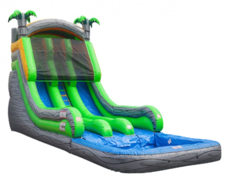Get ready for double the fun with We Three Inflatables 18' Double Lane Marble Gray Slide With Pool inflatable slide at your party! Towering above the festivities with palm trees waving in the wind, this colorful slide features two side-by-side lanes, allowing guests to race to the bottom in an exhilarating competition. Climb to the top and take in the excitement as you prepare to zoom down the slick (wet or dry) surface, feeling the rush of wind in your hair. With its vibrant design and pool landing area, our 18' Double Lane Marble Gray Slide With Pool provides endless entertainment for guests of all ages. Whether you're hosting a birthday bash, school event, or neighborhood block party, this inflatable slide guarantees hours of laughter, excitement, and unforgettable memories for everyone to enjoy in Abbeville and Greenwood South Carolina! Plus, with our reliable and professional team, you can trust that your bounce house rental will be set up safely and efficiently. Book your 18' Double Lane Marble Gray Slide With Pool today and let the good times roll!