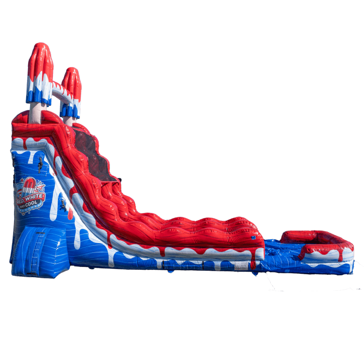 Introducing We Three Inflatables 24' Red, White, and Cool Water Slide With Pool the ultimate way to beat the heat with a burst of color and fun! This towering inflatable slide features a vibrant red, white, and blue popsicle design that screams summer excitement. Standing 24 feet tall, it provides a thrilling ride down a long, slippery lane before splashing into a refreshing pool at the bottom. Perfect for backyard parties and events this eye-catching water slide is sure to be a big hit anywhere in Abbeville or Greenwood South Carolina! Plus, with our reliable and professional team, you can trust that your bounce house rental will be set up safely and efficiently. Book your 24' Red White and Cool Slide With Pool today and let the good times roll!